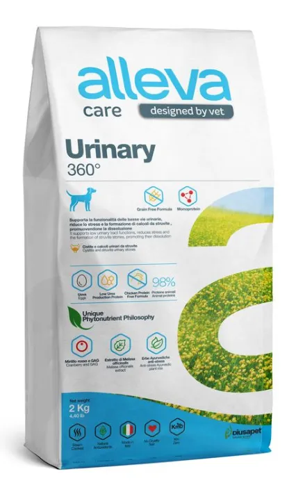 Alleva Care Urinary 360° — Полнорационный сухой диетический корм для взрослых собак, предназначенный для растворения струвитных камней и предотвращения их рецидивов, а также для поддержания здоровья нижних мочевыводящих путей.