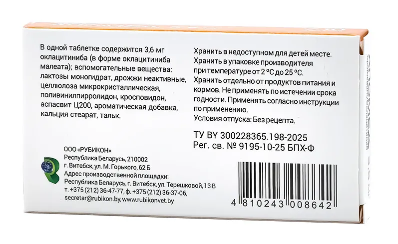 Препарат применяют вне зависимости от приема пищи индивидуально перорально с руки, или в смеси с кормом, или вводят принудительно в пасть в разовой дозе 0,4-0,6 мг оклацитиниба на 1 кг массы животного два раза в день; в качестве поддерживающей терапии при атопическом дерматите – один раз в сутки в той же дозе.