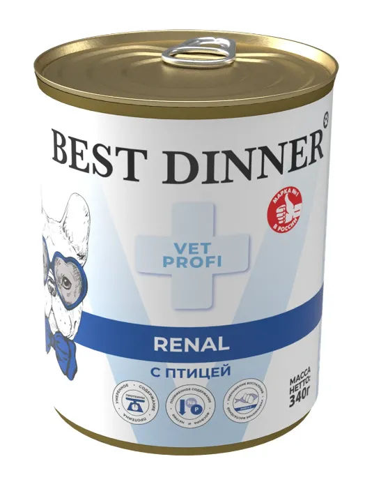 Влажный консервированный полнорационный диетический корм при заболеваниях почек у взрослых собак.
