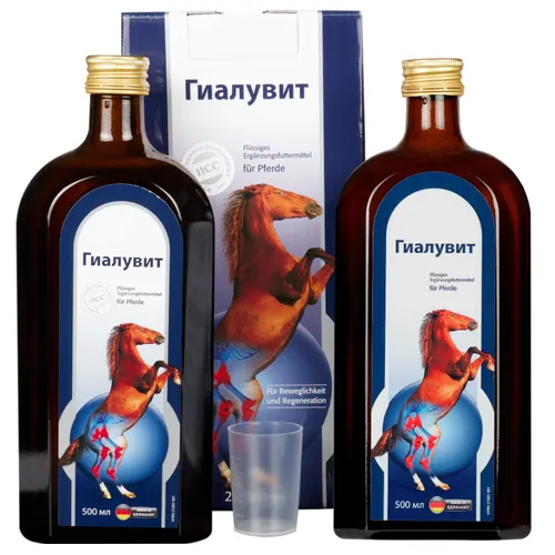 Для лошадей и других крупных животных ГИАЛУВИТ АКТИВ выпускается в упаковке — 500 мл. Две бутылки по 500 мл рассчитаны на взрослую лошадь весом 600 кг.