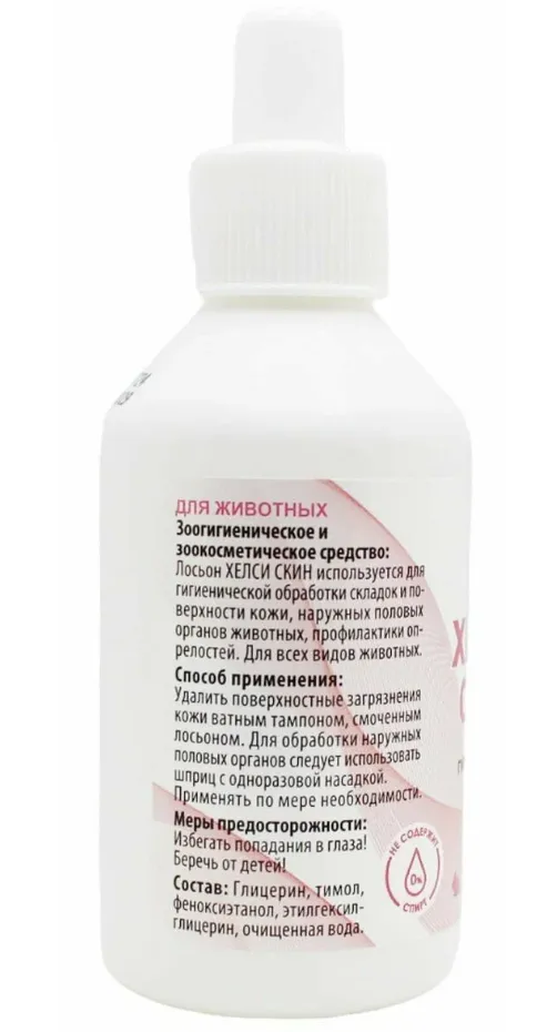 Поверхностные загрязнения кожи удаляются ватным или марлевым тампоном, смоченным лосьоном Хелси Скин. Для обработки наружных половых органов следует использовать шприц с одноразовой насадкой. Для профилактики опрелостей и гигиенической обработки складок кожи лосьон наносят на проблемные места.