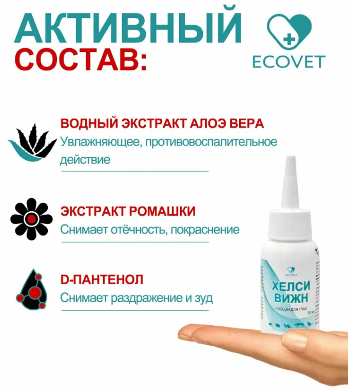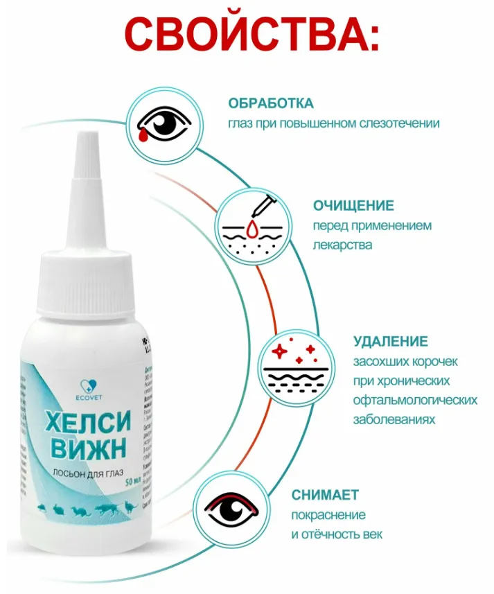 Лосьон Хелси Вижн удаляет сухие корочки экссудата, загрязнения, пыль, песок, очищает кожу вокруг глаз, уменьшает отечность и раздражение век. Натуральные фитоэкстракты обладают противовоспалительными, антисептическими и противоотечными свойствами, устраняют покраснения и зуд. Лосьон поддерживает и нормализует физиологическую влажность и эластичность кожи. В большинстве случаев регулярное применение лосьона позволяет избежать таких заболеваний как конъюнктивит, блефарит, керато-конъюнктивит и т.п. По степени воздействия на организм теплокровных животных лосьон Росинка для глаз относится к малоопасным веществам и в рекомендуемых дозах не оказывает местнораздражающего и сенсибилизирующего действия.