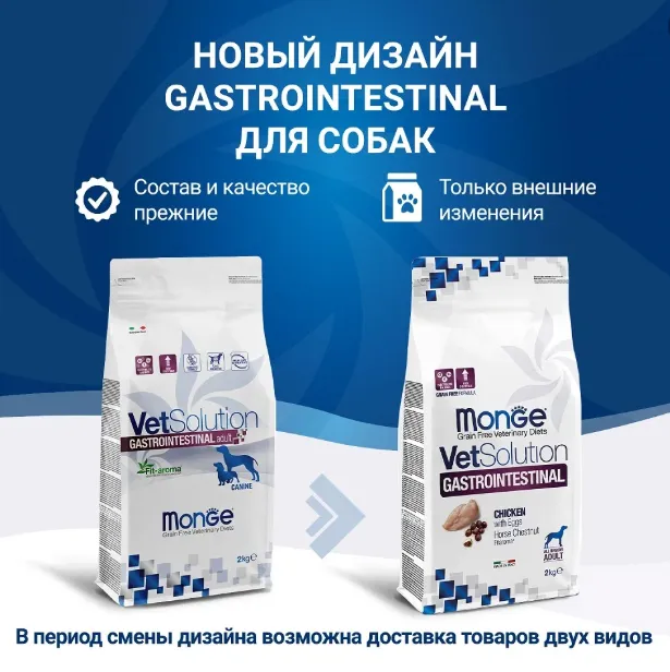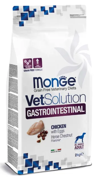 MONGE VETSOLUTION GASTROINTESTINAL ADULT — полнорационный сухой диетический корм из курицы для взрослых собак «GASTROINTESTINAL» для устранения симптомов расстройства пищеварения у взрослых собак. Содержит концентрат сока дыни для нейтрализации свободных радикалов, конский каштан для поддержки здоровья кишечника, ксилоолигосахариды (XOS) для защиты микробиоты кишечника и повышенный уровень натрия и калия и легкоусвояемых ингредиентов.