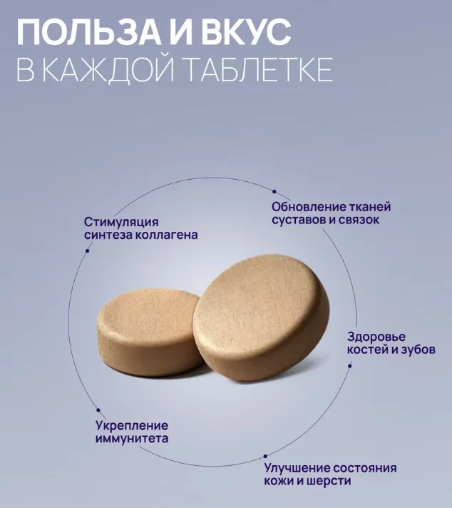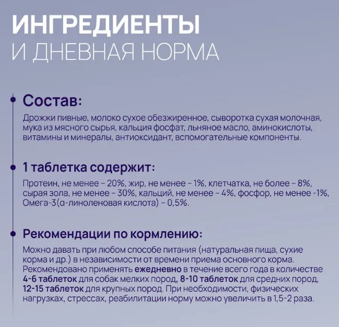 Способ применения: рекомендовано применять ежедневно в течение всего года в количестве 4-6 таблеток для собак мелких пород, 8-10 таблеток - для средних пород, 12-15 таблеток - для крупных пород. При необходимости, физических нагрузках, стрессах, реабилитации норму можно увеличить в 1,5-2 раза.