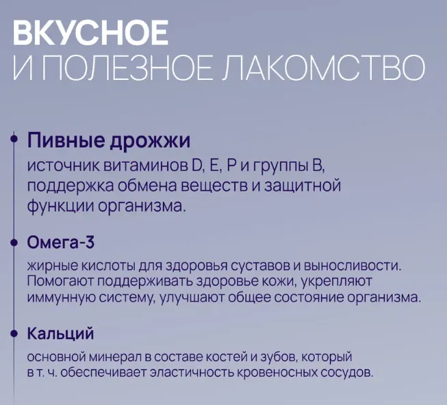 Пивные дрожжи - натуральная пищевая добавка, является источником витаминов (все витамины группы В, а также D, E, P), аминокислот, макро- и микроэлементов и антиоксидантов. Улучшают здоровье питомца, усиливают защитные функции организма, оптимизируют пищеварение и обменные процессы, поддерживают формирование густой и блестящей шерсти.