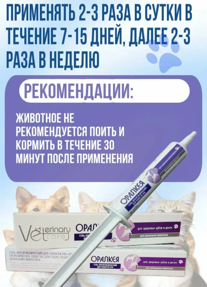 Оралкея – зоогигиенический гель для профилактики образования зубного камня, эффективного удаления загрязнений полости рта, помогает в лечении заболеваний зубов и дёсен. Гигиеническое средство обладает дезодорирующим и антисептическими свойствами. Подходит для кошек, собак и других домашних животных.